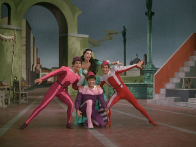 Back inside the theater, the point has come in the play where Bianca and Lucentio finally marry. Everyone is ecstatic, except for Hortensio and Gremio, of course. As the newlyweds sing their devotion to one another with "From This Moment On," the two rejected suitors mope around until they come upon two pretty women, played by Jeanne Coyne and Carol Haney, who eagerly join them in dance. Coyne and Haney were wonderful dancers who frequently assisted Gene Kelly on such films as Singin' in the Rain and Summer Stock. Interestingly enough, Coyne was Mrs. Stanley Donen from 1948 to 1951... and Mrs. Gene Kelly from 1960 until her death in 1973.